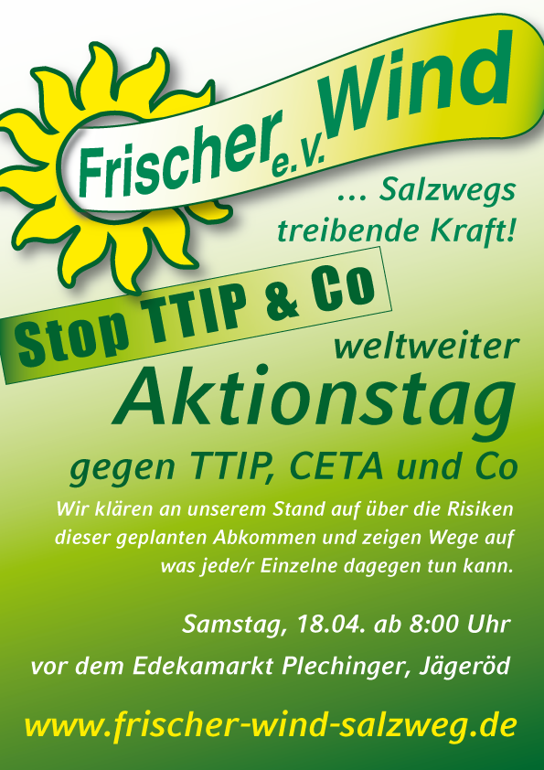 Frische Aktionen Beitragsseiten Frische Aktionen Stop TTIP, CETA & Co Schafkopf Grüner Punkt Ausflüge ISEK-Tag Alle Seiten Seite 1 von 6Hier erhalten Sie Einblick in frische Aktionen der jüngeren Vergangenheit und der näheren Zukunft. Weiter